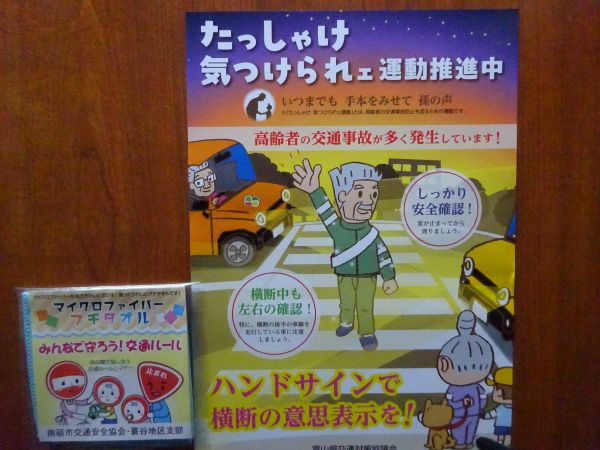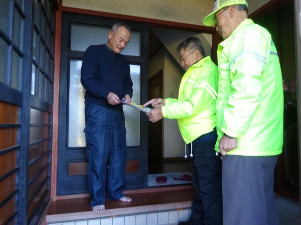 南砺市交通安全協会蓑谷地区支部(嶋文秋支部長)の支部役員10名は、交通事故が多発する傾向にある年末期を捉えた12月6日(土)から7日(日)にかけて、同地区内の高齢者宅180世帯を訪問し「夜間の外出には反射材を身につけて交通事故防止をしましょう」とチラシ等を手渡し、交通安全を呼びかけました。
