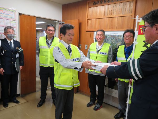 12月10日(水)、南砺市交通安全協会安全運転管理者部会(石崎 功部会長)は、交通ルール順守と運転マナー向上を事業所ぐるみで再確認し、交通事故の防止に繋げることを誓約した104事業所、4,577名の「安全運転の誓い」署名簿を南砺警察署藤井敏雅署長に提出しました。石崎部会長は「安全運転の誓い」を宣言し「交通ルールを順守し模範となる従業員の育成に努めていきます」と決意を述べました。