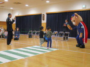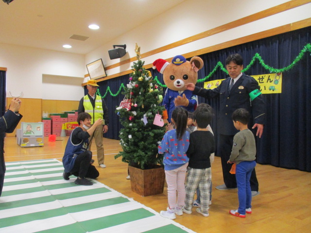 12月10日(水)午前10時から、富山市任海地内の富山市立新保なかよし認定こども園において、富山南交通安全協会新保地域支部が企画した交通安全クリスマスの集いが行われました。同集いには、こども園の年中組園児34名が参加し、初めに富山南警察署交通課の松島係長さんと新保地域支部の植野支部長から交通安全のお話を聞いた後、富山南交通指導員連絡協議会のマスコット「くまちゃん」と一緒に模擬横断歩道を使用して横断歩道の安全な渡り方を実習しました。最後に、参加者全員でクリスマスツリーの飾り付けを行いツリーを完成させた後、新保地域支部役員が扮したサンタクロースが登場し園児にクリスマスプレゼントを贈りました。園児からはお礼のダンスが披露され楽しい一時を過ごしました。
