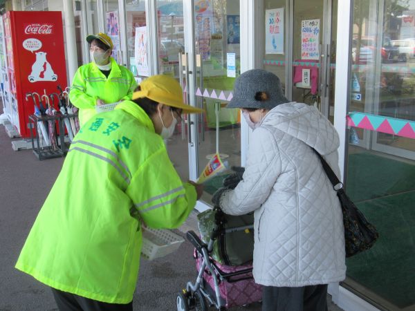 年末の交通安全県民運動期間初日の横断歩道思いやりの日である12月11日(木)午前10時から、黒東交通安全協会他交通安全関係団体約20名が、買い物客等にストップ横断歩道チラシと反射材を配り、年末の交通安全県民運動開催中と横断歩道を利用した道路横断と運転時の横断歩道での一時停止の励行を呼びかけました。