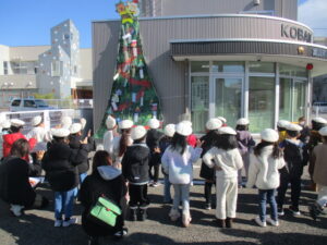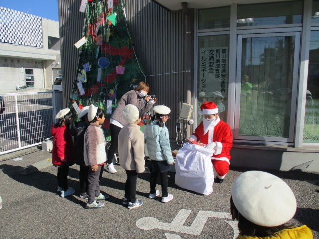 12月11日(木)午前11時から、富山南警察署堀川交番前において富山南交通安全協会堀川地域支部が企画した交通安全イルミネーション点灯式が行われました。同点灯式には、社会福祉法人あおぞらこども福祉会堀川こども園の年長組園児30人が参加し、園児の代表がクリスマスイルミネーションに最後の飾り付けを行った後、同イルミネーションの点灯スイッチを押して点灯させました。最後に、園児達から交通安全の誓いやクリスマスソングの披露があり、警察官が扮したサンタクロースが園児一人一人にクリスマスプレゼントを手渡して点灯式を終了しました。完成した交通安全イルミネーションの美しい光の中で、参加者全員で交通安全を誓いました。