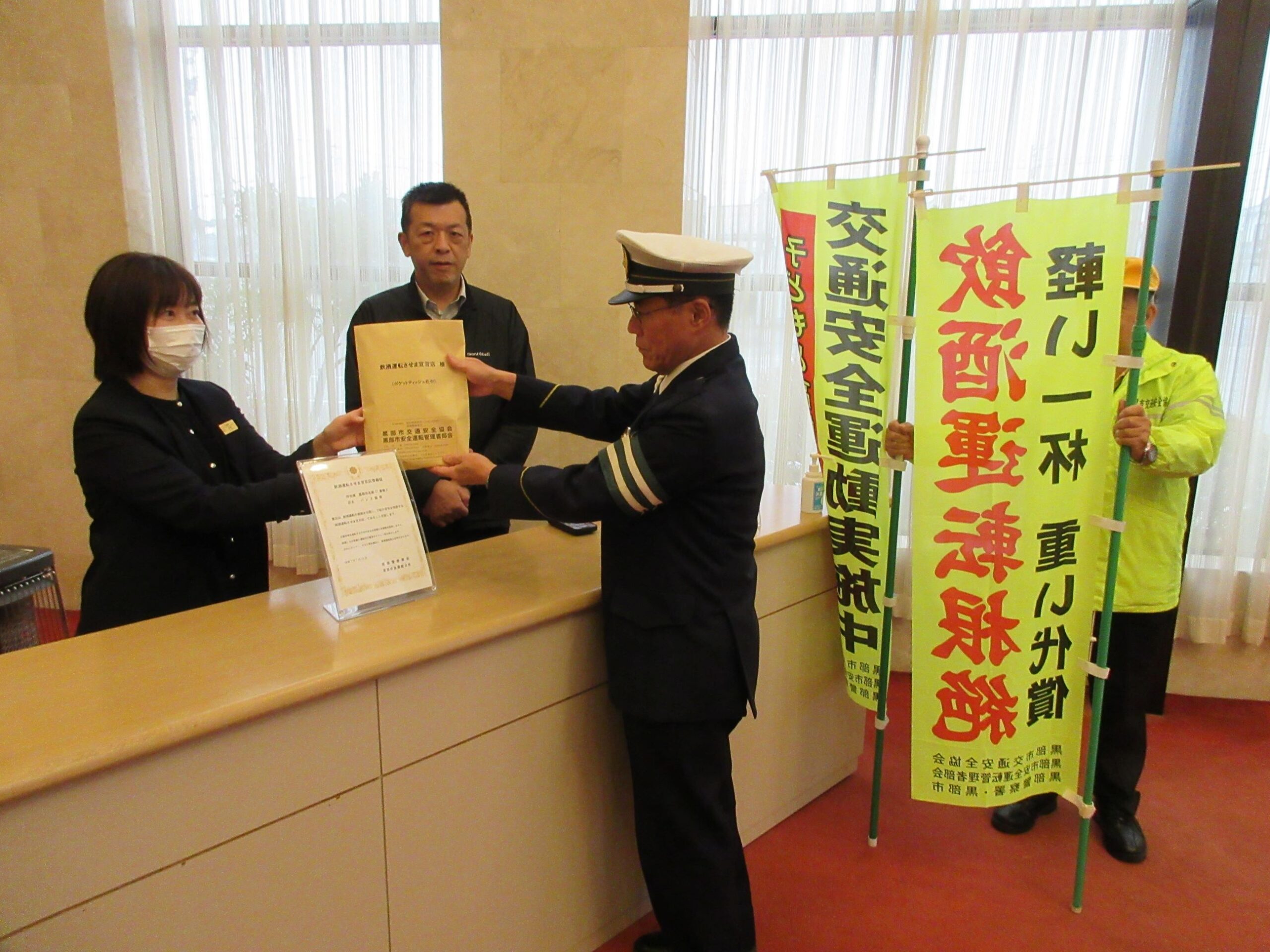 12月12日(金)、「飲酒運転根絶の日」に併せて、飲酒運転させま宣言加盟店(飲食店組合)から来店者に「飲酒運転根絶ポケットティッシュ」を配布してもらい、飲酒運転を根絶するため、黒部市、黒部警察署、交通安全協会は、パレス扇寿、アクア黒部など主要な飲食店に配付いたしました。配付できなかった店には組合から全38店舗に配付していただきました。