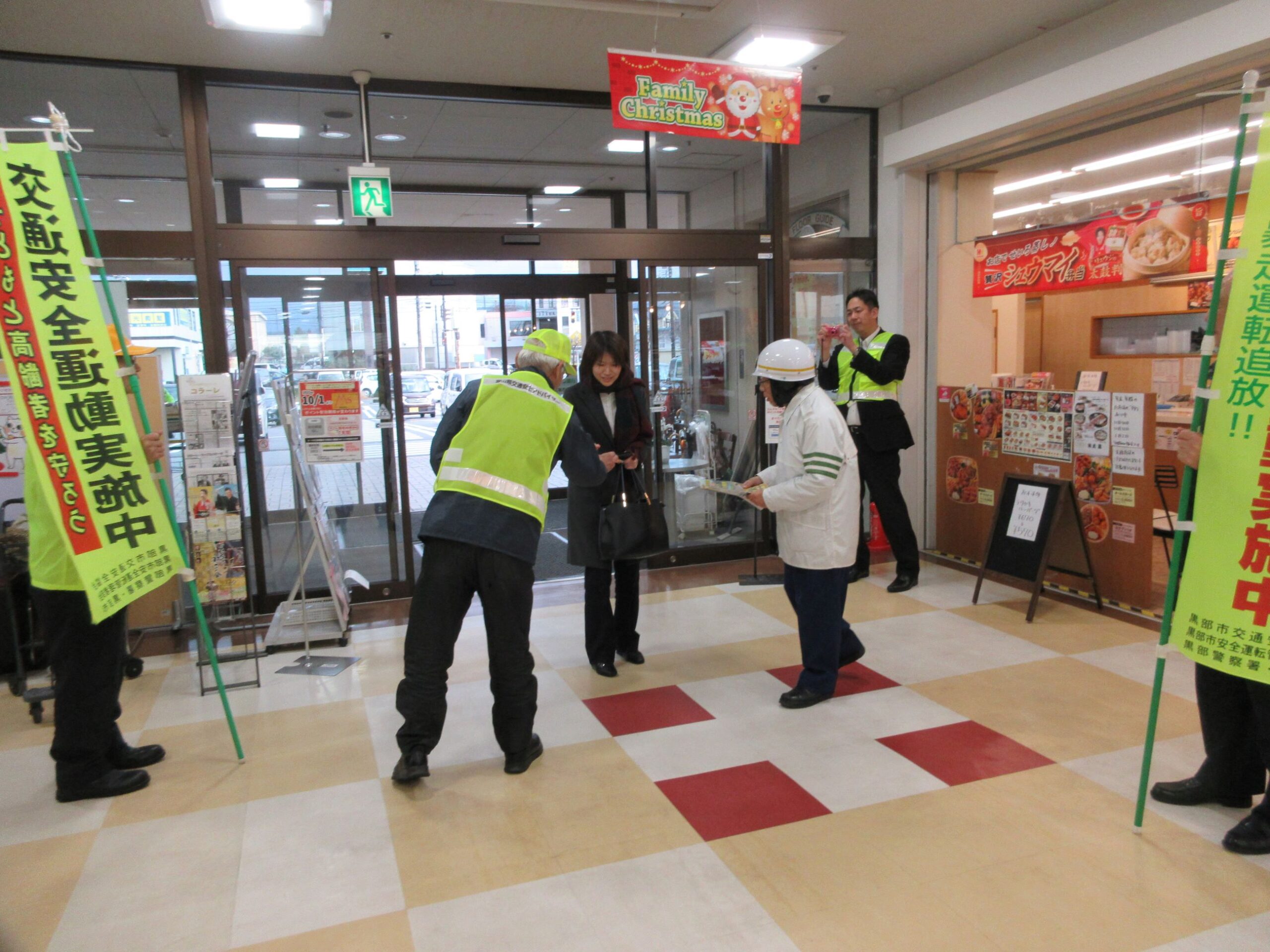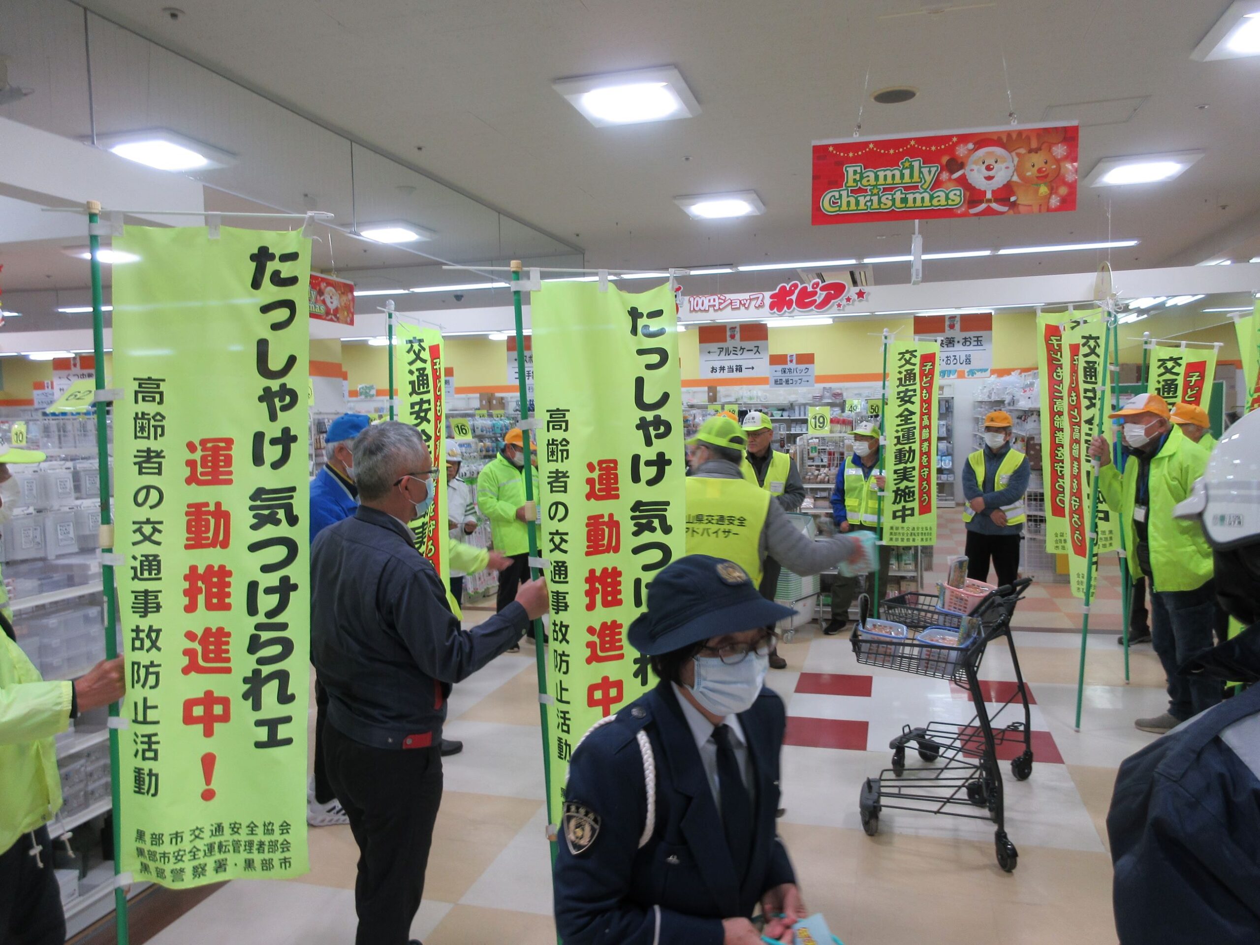 12月15日(月)、「高齢者交通安全呼び掛けの日」に合わせて、黒部市、黒部警察署、交通安全協会、安管部会、交通指導員、アドバイザー約40人が参加して、市内のショッピングセンターにおいて「思いやり、ゆず(柚子)あいで、安全運転ありがとう(湯)」と銘打って、来店者約250人に柚子の入浴剤を配布して、交通安全を呼びかけました。