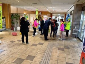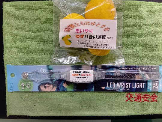 12月11日(木)上市町保健福祉総合センターにおいて、『横断歩道おもいやり』と『夜間の交通事故防止』啓発活動を行いました。啓発活動には、協会職員2人と警察官の他に安管部会等から委嘱を受けているセーフティレディー2人が参加し、同センター利用者に「LEDリストライト」と「ゆず」を配りながら、“おもいやり ゆずり合い運転”をお願いします等と呼び掛けました。