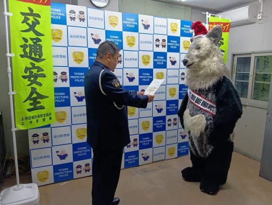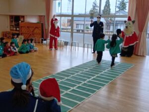 12月15日(月)上市警察署において一日警察署長の委嘱を受けた『カモシカの三太くん』は、その後、サンタクロースに扮し、他の参加者と一緒に宮川こども園で交通安全教室を行いました。志鷹地域交通課長代理が挨拶した後、警察本部交通企画課・中林巡査部長から、腹話術(けんちゃんと車トメさん)を使って、横断歩道の安全な渡り方を教わりました。また、横断歩道の渡り方を「むすんでひらいて」の歌に合わせて、身振りも交えて全員で歌い、遊戯室に準備した横断歩道で『カモシカの三太くん』が渡り方を実演した後、年長児26名が安全な横断歩道の歩き方を実際に行ってみました。最後は、『カモシカの三太くん』から、学習帖、反射ストラップ、交通安全トランプ、三太のイラスト入りカードやシールの入ったクリスマスプレゼントをご褒美として手渡されました。