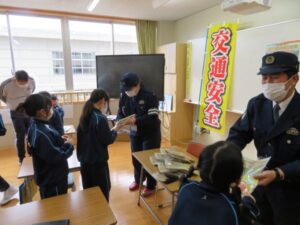 12月17日(水)、南砺市蛇喰地内の南砺つばき学舎で、南砺市交通安全協会井口地域支部(小林文雄支部長)役員及び当学舎の4年生児童12名は、警察官から交通安全講話を聞いた後、児童が家族に「安全運転お手紙」と地域になじみ深い椿をモチーフにした「椿クッキー」及び安全運転チラシを渡し、交通安全を呼びかけました。