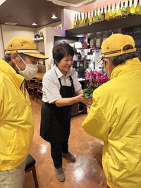 大島支部(支部長:山中義直)の役員は、12月12日(金)午後6時30分から、射水警察署員と合同で、支部管内の飲食店14店舗を巡回し、ハンドルキーパーのキャラクターを貼付したシクラメンの鉢植えとともに飲酒運転根絶のチラシをスタッフに配付して、年末年始に増える飲酒客への飲酒運転防止広報の協力を依頼しました。