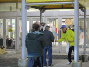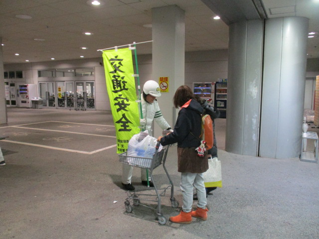 12月22日(月)午後5時から、富山市上袋地内のショッピングセンター「アピタ富山店」において、富山南交通安全協会の蜷川、堀川、堀川南地域支部(通称三本川)が合同企画した交通安全キャンペーンが行われました。同キャンペーンには、富山南警察署員、蜷川、堀川、堀川南各地域支部役員、交通指導員、地域交通安全活動推進委員が参加し、買い物に訪れた皆さんに、交通安全チラシや反射材を配付して交通事故防止を呼び掛けました。