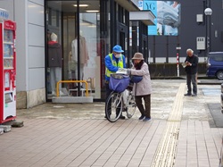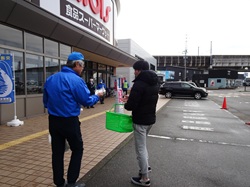 大島支部(支部長:山中義直)の役員は、地域交通安全活動推進委員と合同で、12月17日(水)午前10時から約30分間、イータウン大島「アルビス大島店」前で、年末の交通安全県民運動実施中のチラシを買い物客100人に配布し、交通事故防止を呼びかけました。