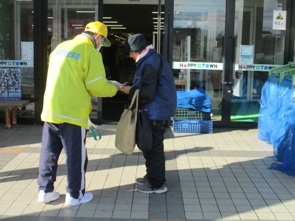 12月18日(木)ハッピータウン氷見ショッピングセンターにおいて、東支部10名は来客に反射タスキと啓発チラシ等を配布して、夕暮れ時・夜間の交通事故防止を呼びかけました。