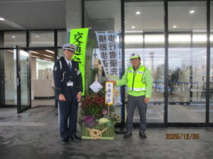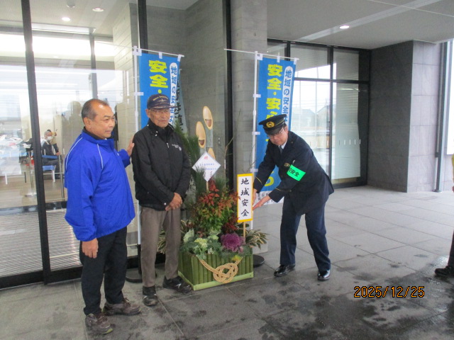 12月25日(木)午前10時から、富山南警察署正面玄関前において、交通安全と地域安全を祈願した門松の設置式を行いました。同門松は、富山南交通安全協会山室、蜷川、堀川、堀川南の各地域支部と富山南防犯協会山室校下防犯連合会が、管内の交通安全と地域安全を願い合同で設置したもので、山室地区にお住まいの黒牧祐三さん(92歳)の指導を受け、役員有志が制作したものです。同設置式には、富山南警察署員、交通安全協会地域支部役員、防犯連合会役員が参加し、「安全、安心な町作り」を願って「交通安全」、「地域安全」と書かれたプレートを取り付けて門松を完成させました。