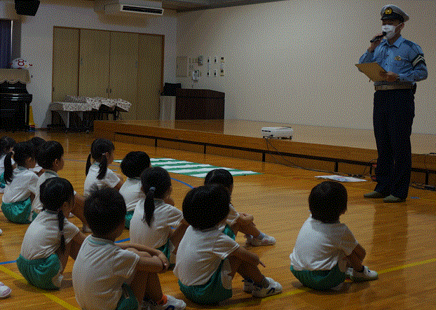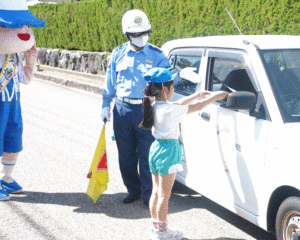 大野忠雄 東五位支部長は高岡警察署交通課ともに、みつば保育園児への交通安全教室を開催し、終了後、同保育園の駐車場入り口通路において、五位小学校区内の交通指導員に協力を求め、行き交うドライバーに園児から交通安全を呼びかけてもらいました。