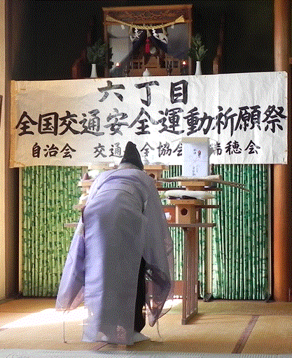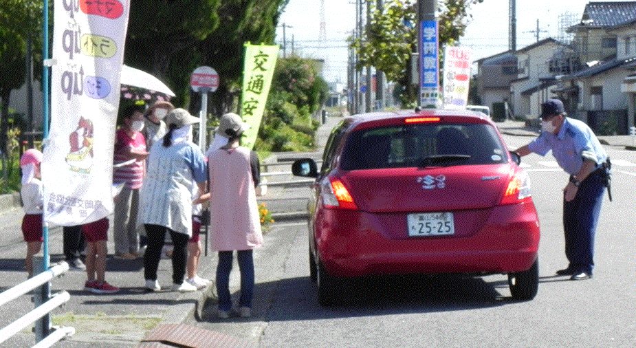の祈祷を施した交通安全マスコットを戸出北部保育園児等の協力のもと公民館前の市道にて、行き交うドライバー等に配付しました。