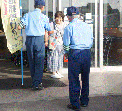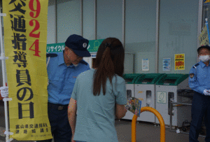「交通指導員の日」に因んで交通指導員の有志が、大阪屋ショップ出来田店前において来店者に交通ルールの遵守を呼びかけました。当協会の事務局長も呼びかけに参加しました。
