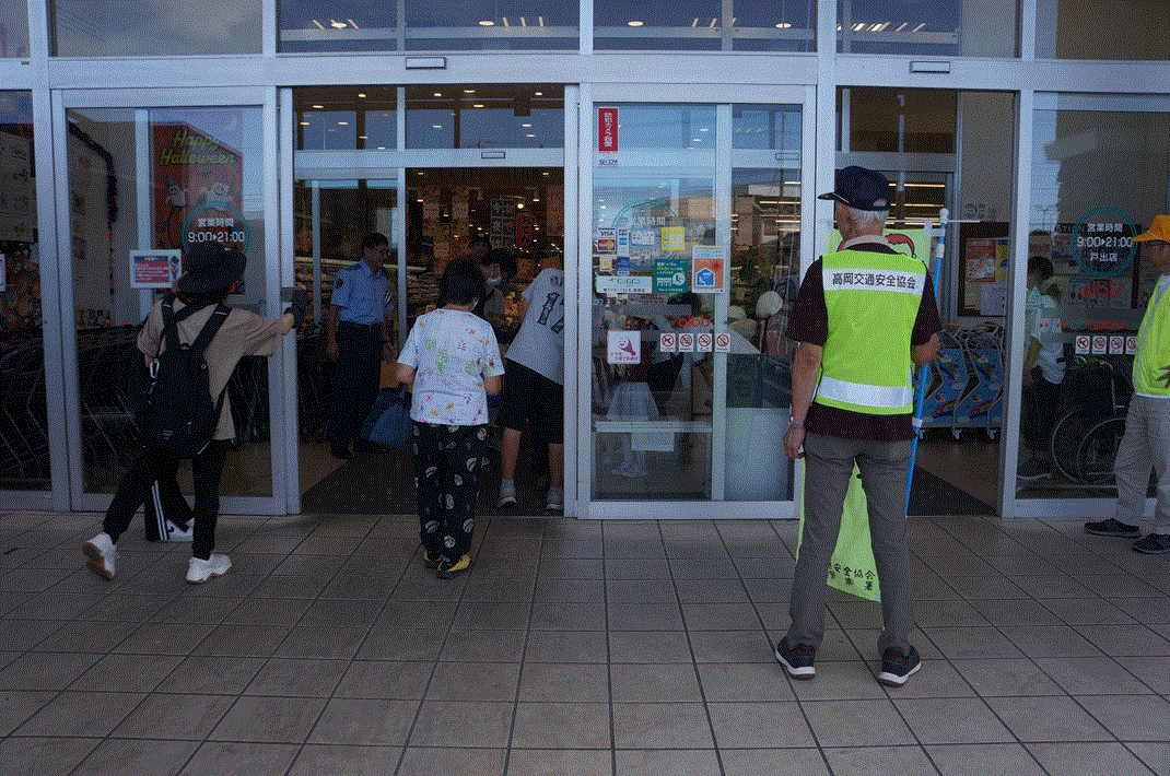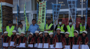 当協会の戸出中田交通安全連絡協議会は、市野瀬保育園からの協力要請を受けて、アルビス戸出店前において雷鳥クラブ員によるミニ演奏会の後に、聴衆していた来店者等に交通安全を呼びかけました。