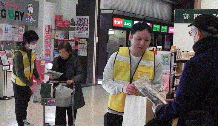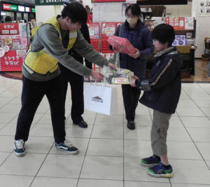 高岡市交通安全推進協議会、高岡警察署及び高岡法科大学ボランティア部員とともに、イオンモール高岡東館において、反射材を手袋に貼付した物を配付しながら、反射材の着用を呼びかけました。