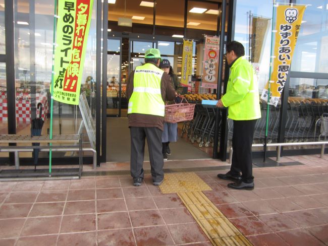 年末の交通安全県民運動中の12月15日、立山町交通事故防止対策協議会や交通安全アドバイザー、協会職員は、立山町辻にある「アルビス立山インター店」において交通安全街頭キャンペーンを行いました。同キャンペーンでは、LEDライトや交通安全チラシなどを利用するお客様に配りながら、年末における交通事故防止を呼びかけました。