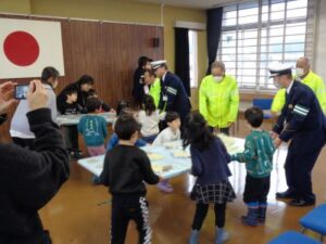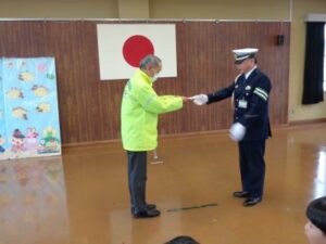 12月25日(木)小矢部市交通安全協会荒川支部(支部長 青鉢敏明)が作成した、高さ2メートル50センチの「交通安全ジャンボ門松」また、石動きらりこども園年長園児が、折り紙の馬を飾った交通安全の願いが書かれた絵馬を貼った「交通安全パネル」を小矢部警察署に贈呈し、ジャンボ門松・交通安全パネルを小矢部警察署玄関に設置し交通安全を呼びかけます。
