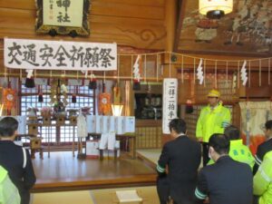 1月8日午前9時から朝日町の脇子八幡宮、同日午前10時30分から入善町の入善神社において、朝日地区と入善地区における交通安全祈願祭を開催しました。双方の神社において。黒東交通安全協会会長、入善警察署長、朝日町と入善町の交通安全対策協議会長や関係団体の代表がそれぞれ玉串をささげて、地域の交通安全を祈願しました。昨年は3名の高齢者の方が亡くなっており、黒東交通安全協会長は、今年は高齢者を中心に交通安全教育や指導を徹底し、死亡事故を防止するとともに1件でも交通事故が少なくなるように関係団体と協力して活動していきたいと抱負を述べました。