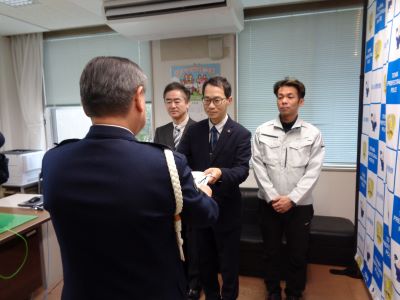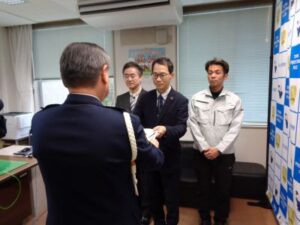 1月13日(火)小矢部安全運転管理者協議会(会長 大家 芳夫)は、1月9日に埴生八幡宮において行われた交通安全合同祈願祭においてお祓いを受けた小矢部安全運転管理者協議会に加入している55事業所1,973名分の「交通安全誓いの署名簿」を小矢部警察署に提出しました。