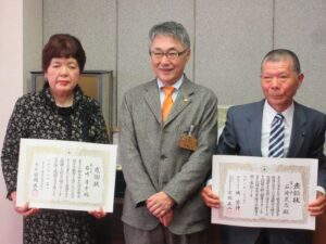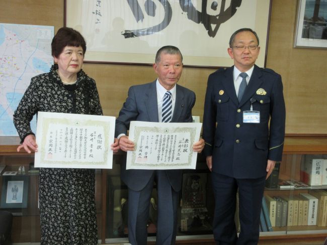 1月14日「第66回交通安全国民運動中央大会」において、交通指導員の石﨑武志さんが交通安全功労者として交通栄誉章「緑十字銀賞」を受賞されました。また、奥様がその功労に対する感謝状を受けられました。