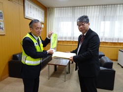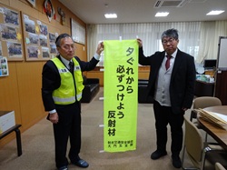 当協会の大門地区5支部(浅井、櫛田、大門、二口、水戸田)は、合同事業として、大門小学校の児童に「交通安全標語」を募集し、1月19日(月)に、板谷龍二協会副会長が、大門小学校において優秀作品の表彰を行いました。福山暁雄校長を代表者として、啓発グッズなどの参加賞と、優秀作品10点の応募児童には、表彰状と図書券などの賞品・ミニのぼり旗などを贈呈したほか、優秀標語を記したのぼり旗を制作し、同校周囲に1年間掲揚することとしています。