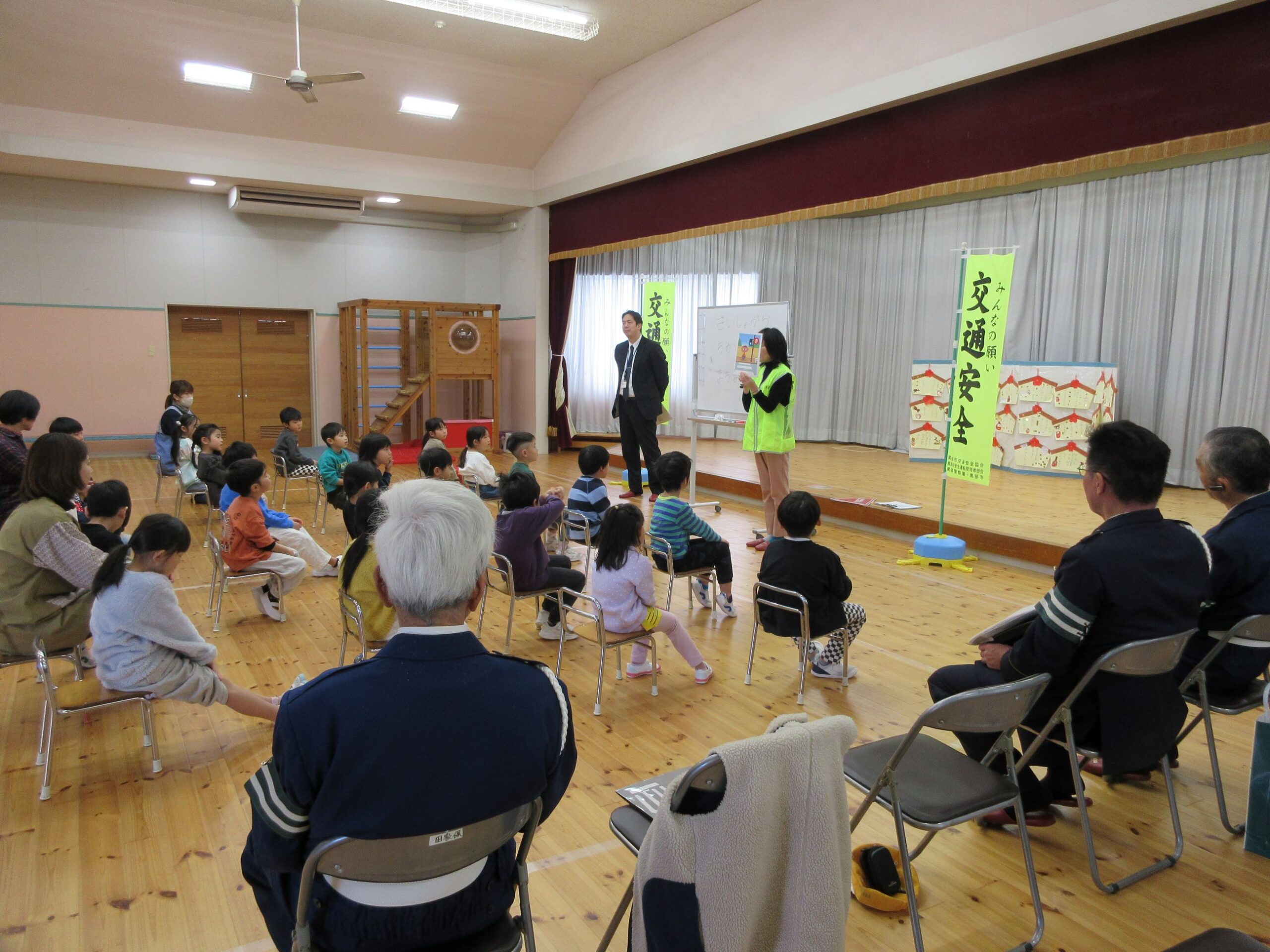 始めに協会員が、1年生になったら歩いて小学校まで行くこととなるので、「道路の歩き方」などを説明し、交通安全を呼び掛けました。