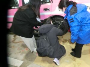 チェーンの着脱、スタック脱出体験、雪道での坂道発進などについて講習と実技を交