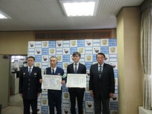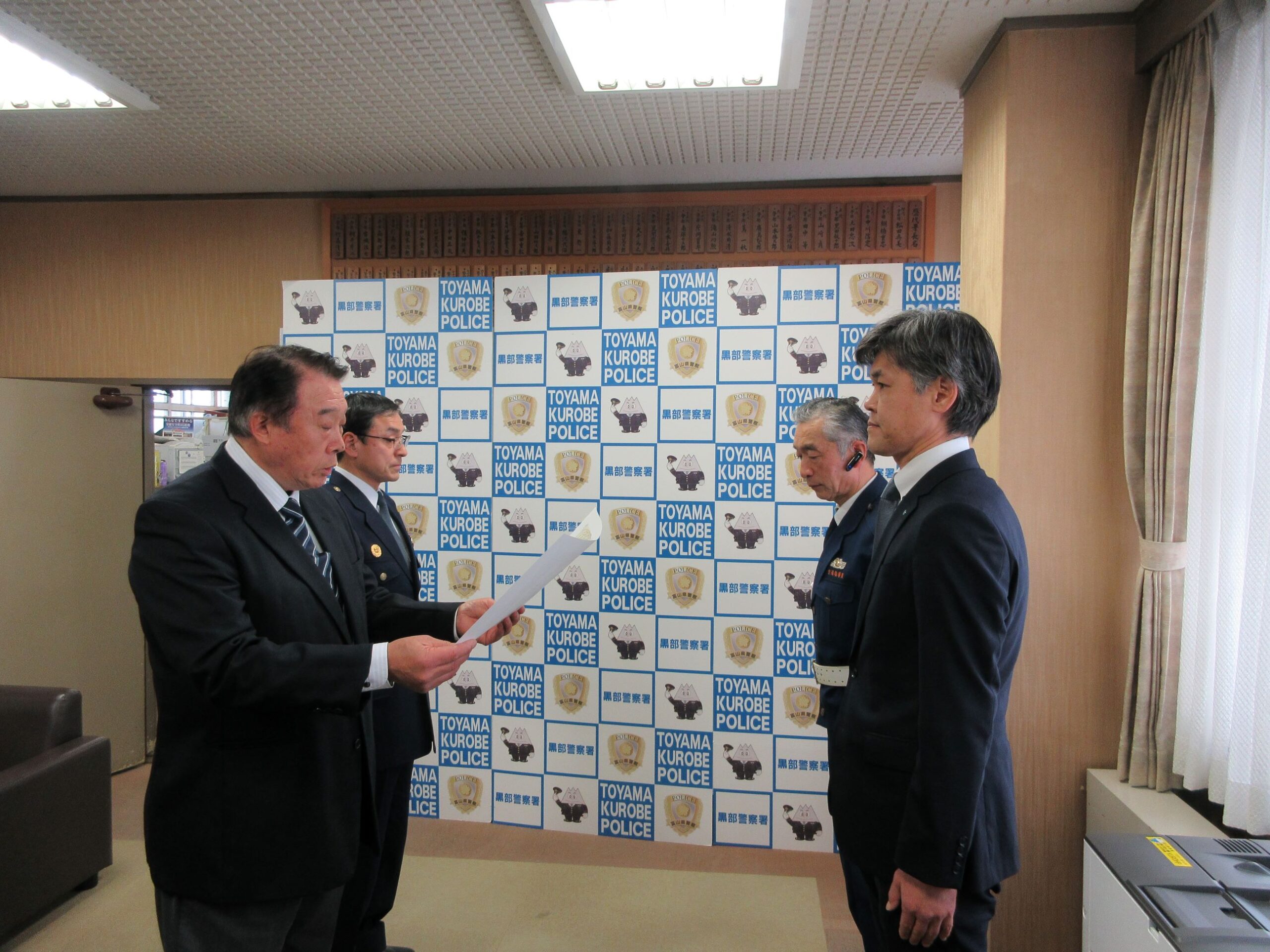 受賞された方々は同月28日(水)に、黒部警察署を訪れ南氏からは受賞の報告が、同大会を欠席されたYKK㈱黒部事業所には、川本黒部市交通安全協会長から表彰状の伝達がありました。