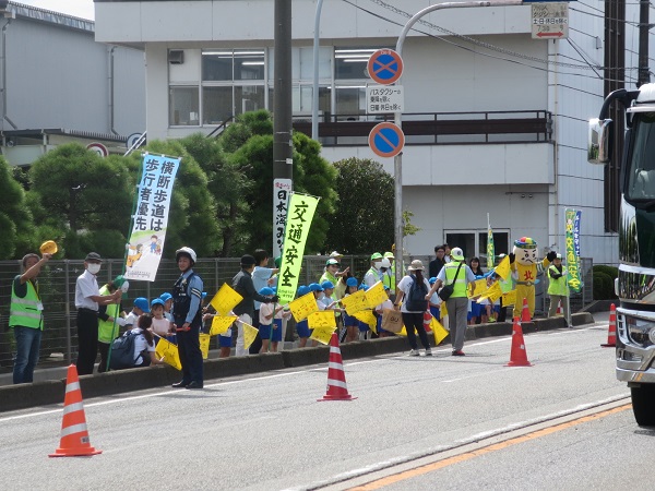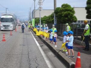 9月22日午前10時30分から富山市新庄本町地内の河上金物鉄鋼センター前国道41号歩道上で、富山カワイ幼稚園児と新庄さくら保育園児、地区長寿会、新庄北地域支部員、富山中央安全運転管理者協議会、富山中央警察署員等約120人が参加して、手作りの交通安全旗を掲げ、ドライバーに交通安全を呼びかけました。