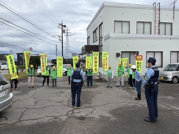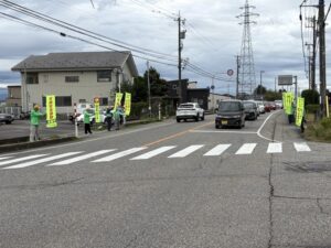 9月25日午前7時30分から、富山市水橋上桜木地内の県道富山滑川線水橋桜木交差点で、当協会水橋東部地域支部員、富山中央警察署員等16人が、のぼり旗を掲示し、ドライバーや自転車利用者に交通安全を呼びかけました。
