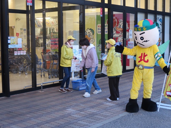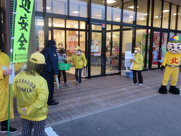 11月12日午後4時30分からアルビス新庄銀座店で、当協会新庄北地域支部員と新庄北マン、富山中央警察署員等16人が参加し、チラシや反射材を配布して夕暮れ時の交通事故防止を呼び掛けました。