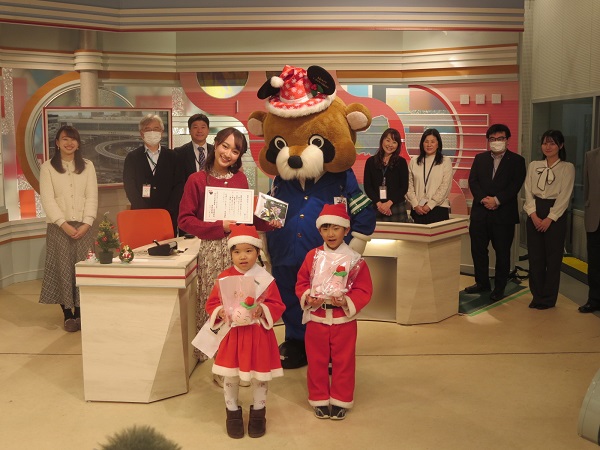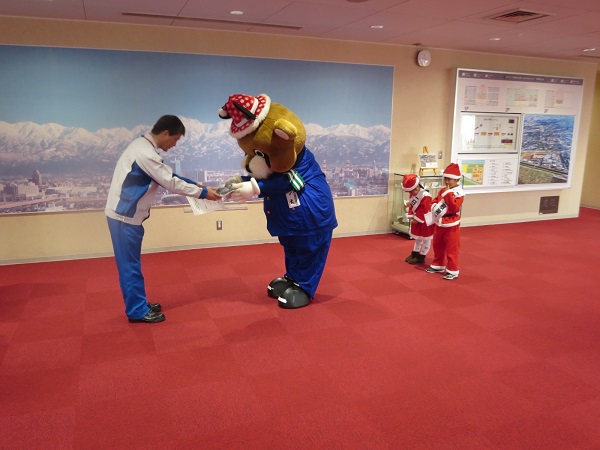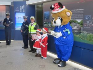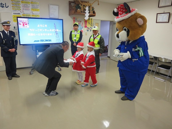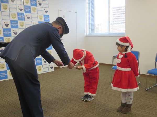12月15日午後1時15分から富山中央警察署で「1日警察署長委嘱式」が行われ、石田富山中央警察署長から委嘱を受けたチビッ子サンタに扮した奥田保育園年長児男女各1名とタヌキの交通指導員ポン太が事業所訪問に出発しました。