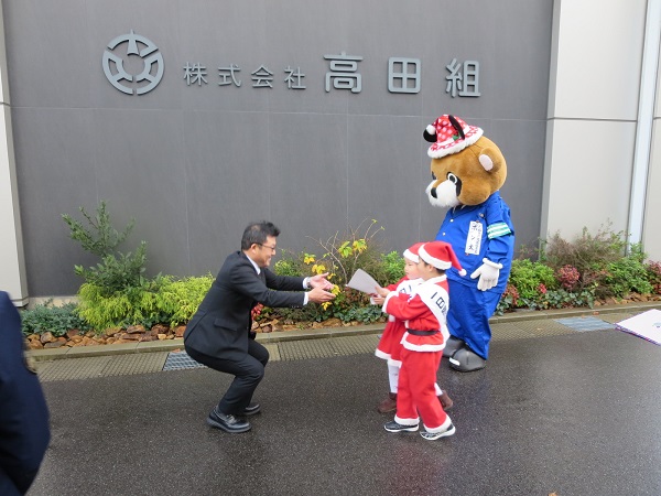今回の事業所訪問は、北陸電力株式会社・南電気工事株式会社・株式会社チューリップテレビ・アステラス製薬株式会社・株式会社高田組の5社を訪問し、交通安全メッセージ文やポン太のマスコット等を渡して、従業員の安全運転を呼びかけました。