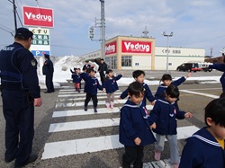 当協会牧野支部(支部長:越後満)は、射水警察署とともに、2月12日(木)高岡第一学園牧野みどり保育園(参加園児年長児31名)で、交通安全教室を開催しました。交通安全DVDの視聴の後、警察官のお話を聞いて、園周辺の道路と信号交差点を使った横断歩行練習を行いました。