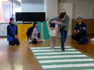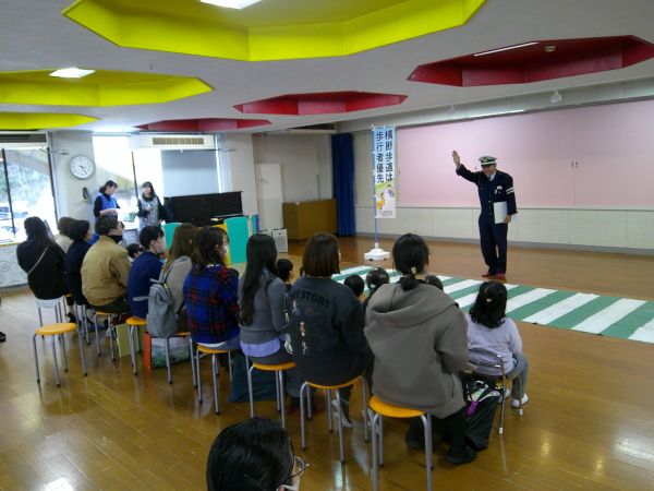 2月20日(金)、富山市立山田保育所(所長 浦畑清恵)において、親子交通安全教室が行われた。横断歩道の渡り方について富山西警察署員から説明を受けた後、園児が「左右をよく見て」「必ず手をあげて」正しく渡る練習を何度も行った。教室にはJAF富山支部も参加し、チャイルドシートの重要性と正しい着装等について学んだ。
