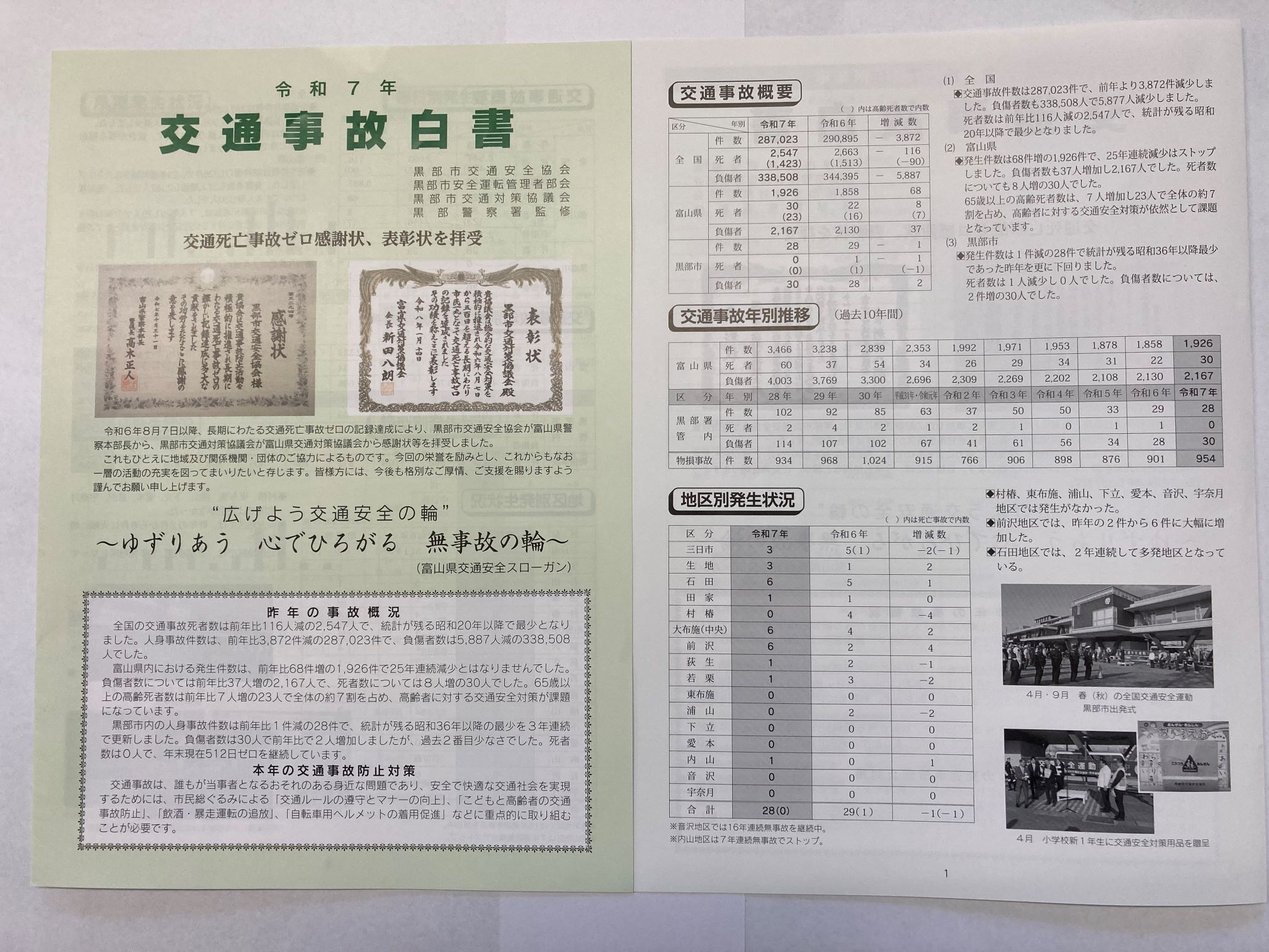 黒部市交通安全協会、黒部市安全運転管理者部会は、黒部市における令和7年交通事故白書(7ページ)を500部作成し、関係機関・団体及び安全運転管理者事業所等に配付しました。 白書には、交通事故年別推移、地区別発生状況、月別発生状況、曜日別発生状況、時間別発生状況、類型別発生状況、路線別発生状況、高齢者の交通事故発生状況等が掲載されているほか、各種交通安全キャンペーン等の活動状況が写真として掲載されています。