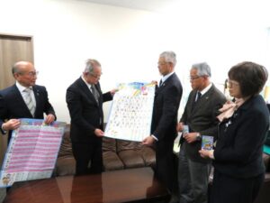 交通安全あいうえお表は、五十音の平仮名と「あぶない、あぶない、とびださない!」などの標語を記している。岩﨑修会長らが「事故に遭わないよう、家庭で標語について話し合ってほしい」と松本謙一教育長に手渡しました。