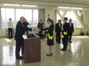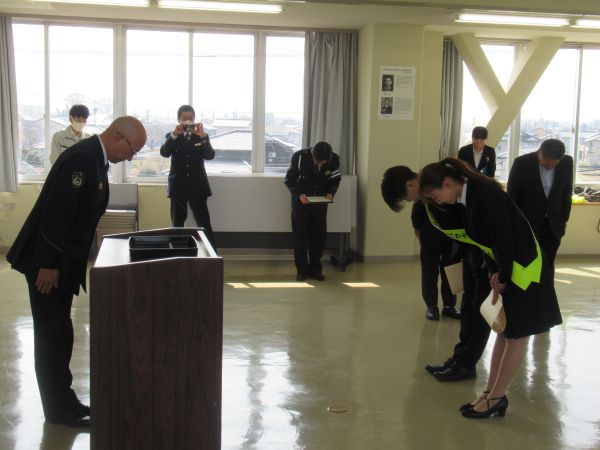 令和8年3月30日(月)午前10時から、西尾尚真さん(入善町役場)と板本みつきさん(朝日町役場)の2名が、交通安全アンバサダーとし2年間の任期を終えたことから、入善警察署長からの感謝状が交付されました。交付式には黒東交通安全協会長と黒東地区交通安全運転管理者部会長も列席し、六渡入善警察署長と深松黒東交通安全協会長から、2年間の任期期間中の各種交通安全キャンペーンに参加してもらったことに対する感謝の言葉と、任期終了後についても知人友人等に交通安全の呼びかけを依頼しました。