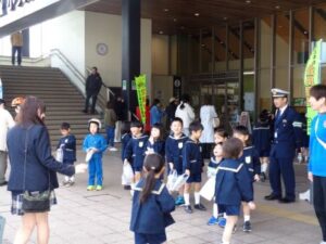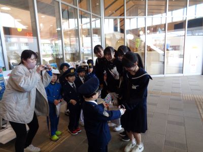 3月12日(木)当協会と小矢部警察署が委嘱するメルヘンポリス(石動西部こども園年長園児)が、4月1日から導入される自転車の青切符運用されることに先立ち、メルヘンポリスと小矢部警察署が、「いのちをまもるヘルメット」と題するキャンペーンを石動駅の利用者に対し、交通安全チラシと交通安全啓発グッズを配布し、「ルールを守ってください」「交通安全に気を付けてください」などと声をかけ、交通安全を呼びかけました。