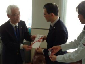 3月30日(月)小矢部安全運転管理者協議会(会長 大家 芳夫)は、令和8年度の小矢部市内の新入学児童に対し、メルギュー・メルモモの反射材を寄贈し、沼田教育長に目録を手渡しました。