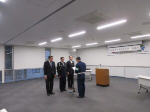 委嘱状の交付を受けた指導員 南協議会会長から決意表明を受ける武隈市長、寺島署長、川本協会長
