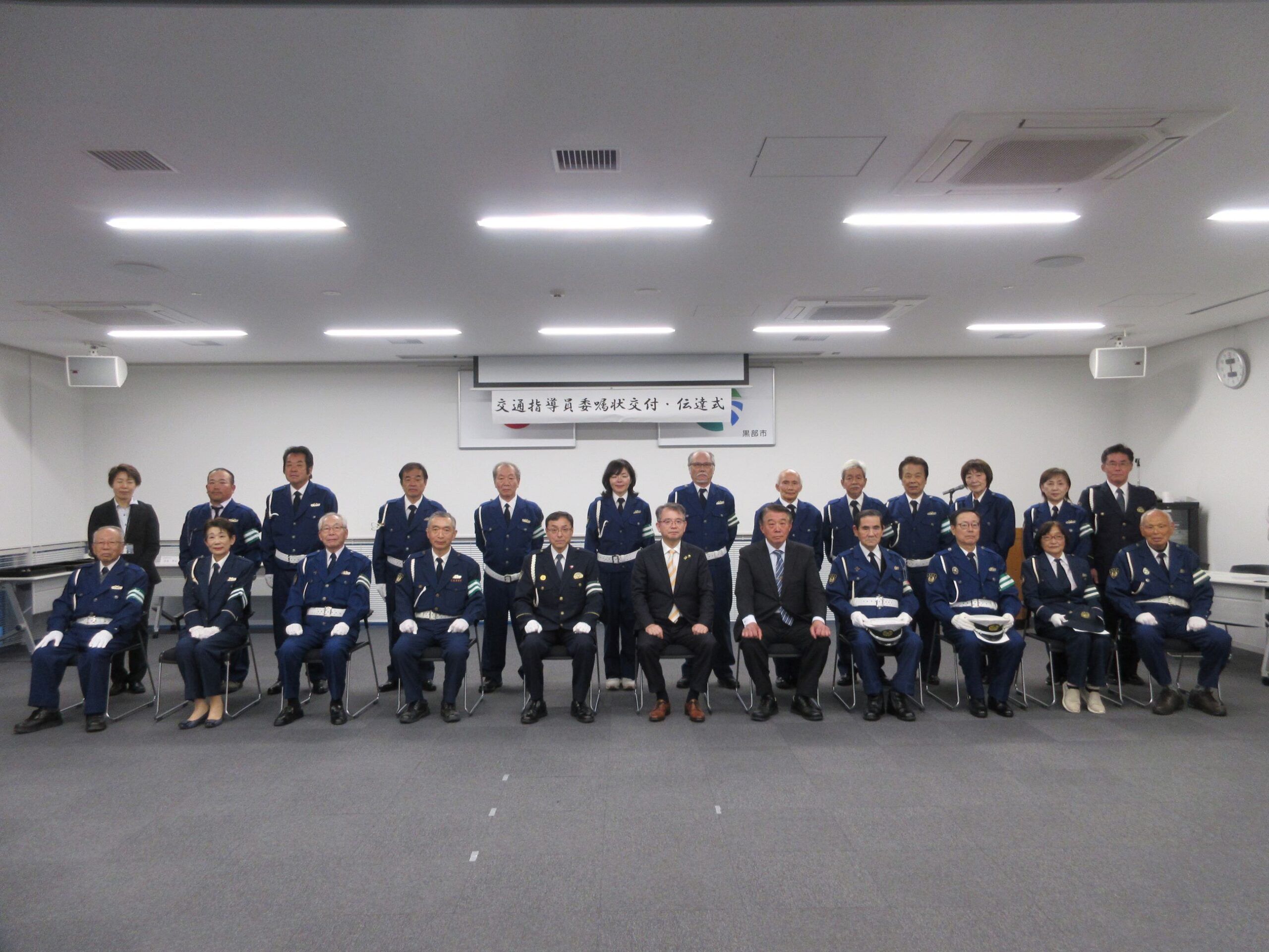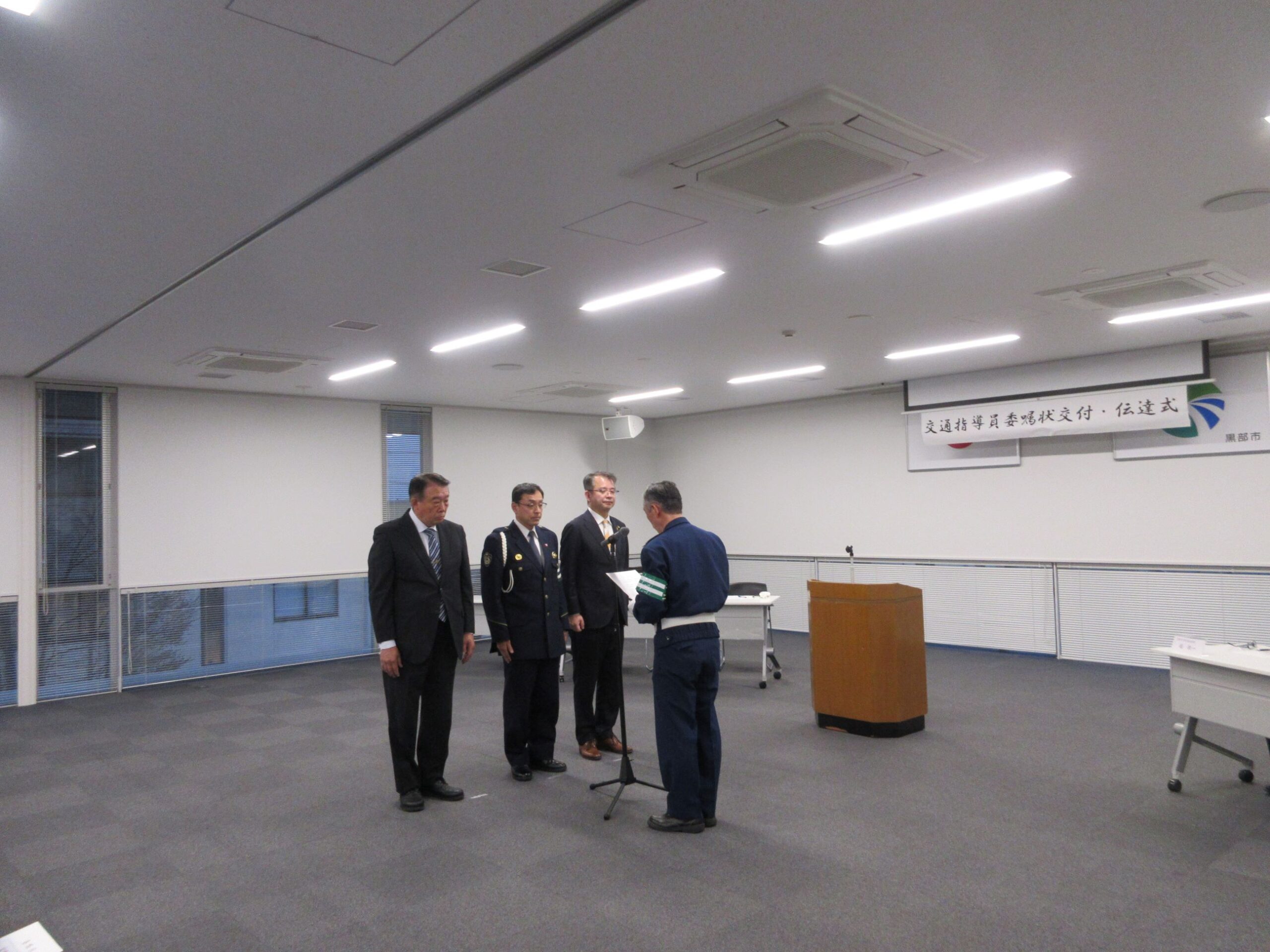 4月1日(水)午後5時30分から、黒部市役所会議室において、交通指導員及び黒部地域交通安全活動推進員への委嘱状交付式が開催され、黒部市長委嘱交通指導員には武隈市長から委嘱状が交付式され、警察本部長委嘱交通指導員等には、寺島黒部警察署長から委嘱状の伝達が行われました。