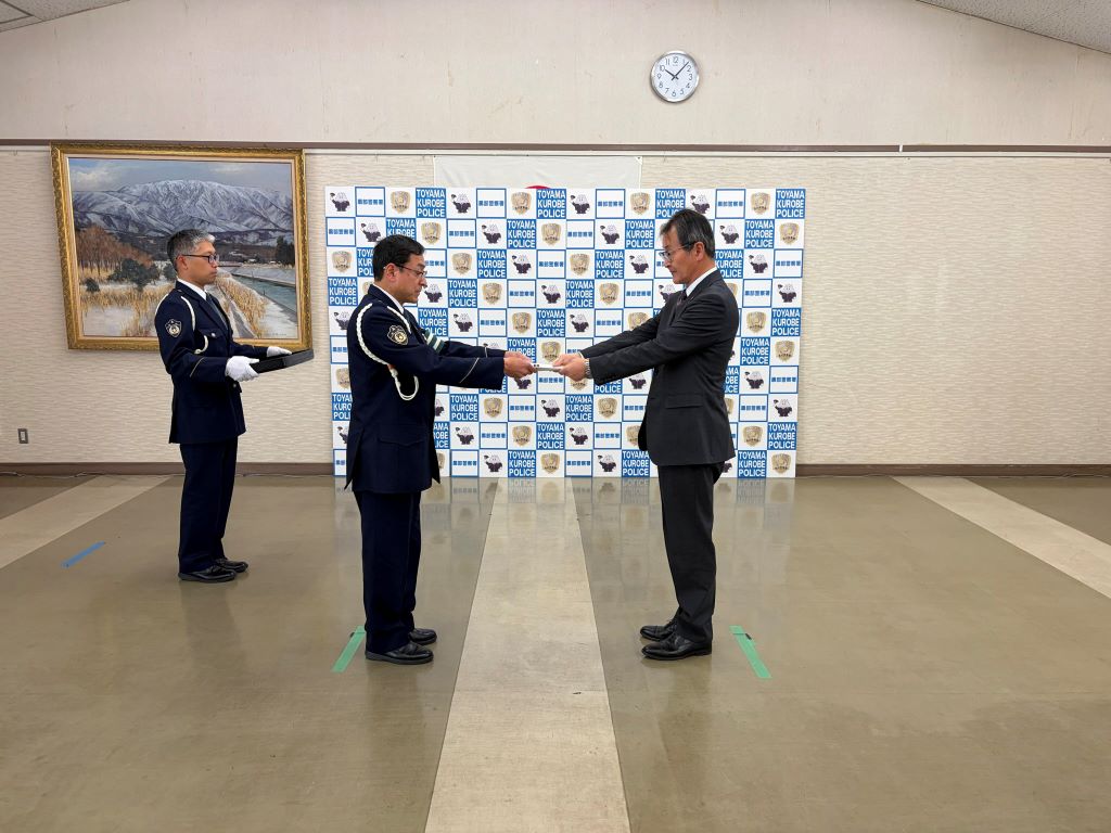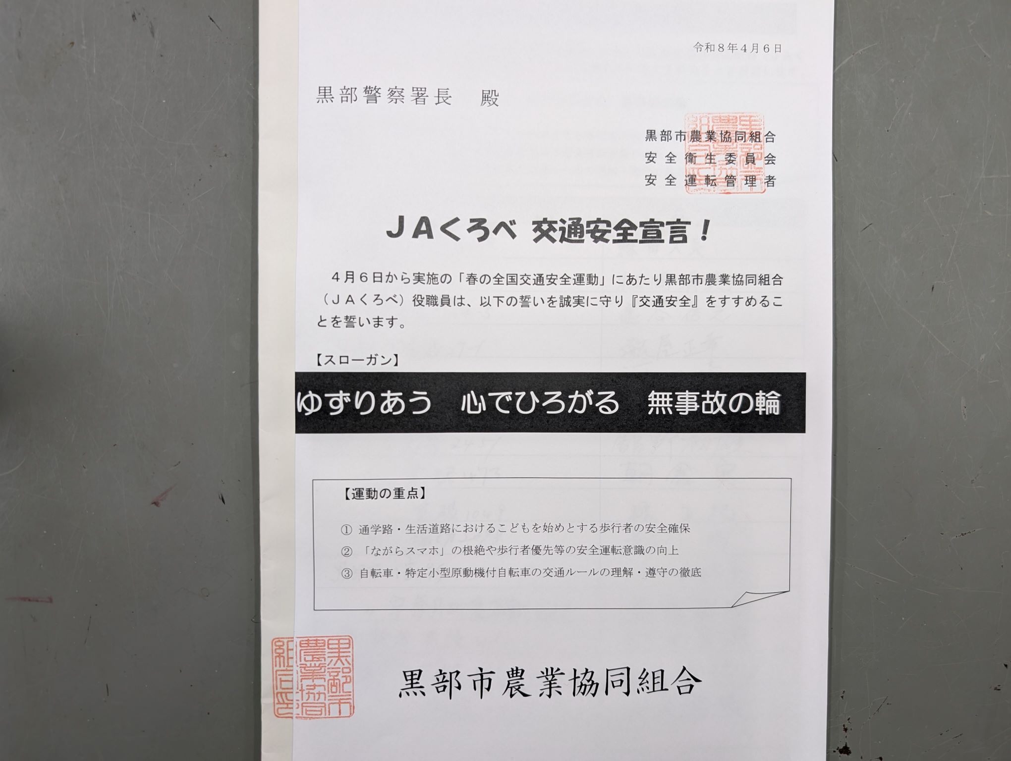 4月6日(月)、黒部市農業協同組合の「JAくろべ交通安全宣言!」署名簿提出式が開催され、森田久義代表理事組合長から、以下の誓いを守るという役職員139名分の署名簿が、寺島黒部署長に提出されました。
