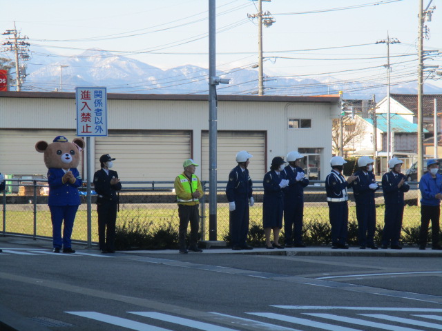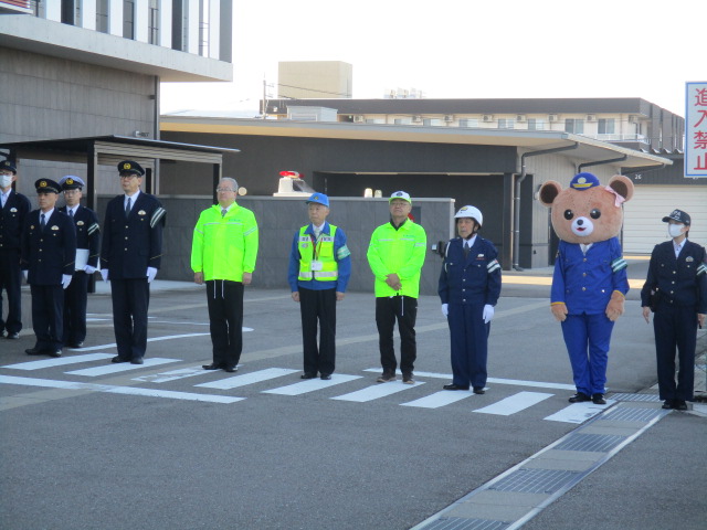 春の全国交通安全運動の初日である4月6日(月)午前7時から、富山南警察署正面玄関前において出発式が行われ、富山南警察署員、富山南交通安全協会役員、同安全運転管理者部会員、交通指導員、地域交通安全活動推進委員等約50人が参加しました。金澤富山南警察署長、稲田富山南交通安全協会長のあいさつの後、広報部隊の出発があり、交通事故防止を願って参加者全員で見送りました。