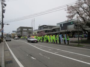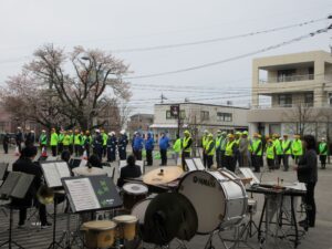 出発式では、交通対策協議会長(黒部市長)のあいさつ、黒部警察署長及び交通安全協会長の激励、桜井高校吹奏楽部員による交通安全宣言の後に、同吹奏楽部による演奏の後、同吹奏楽部員による「出発!」の号令でパトカーが街頭指導パトロールに出発しました。