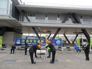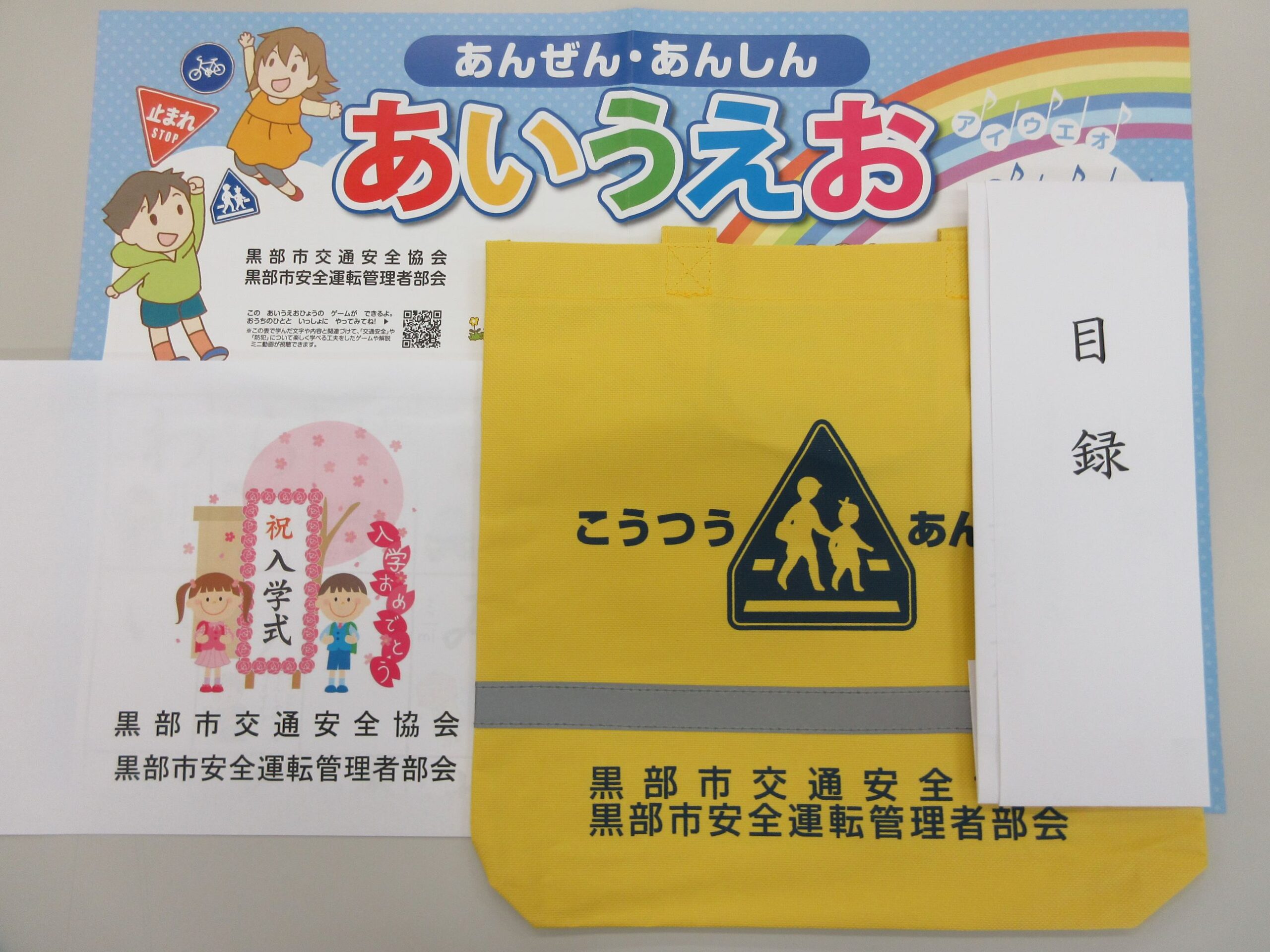 4月6日(月)に開催された「令和8年春の全国交通安全運動」の黒部市出発式において、本年4月に入学する新1年生262人に配付する交通安全用品の交付式が開催され、川本会長から武隈市長に交通安全用品(反射材付交通安全バック、交通安全あいうえお表)を、中西部会長から齋藤教育長に目録が交付されました。