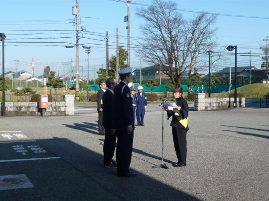 大会に集まった村民の前で、舟橋村長、上市警察署長、村議会議長、上市区域交通安全協会長が挨拶し、交通安全母の会代表者が交通安全宣言を行い、村民の願いである無事故を誓いました。