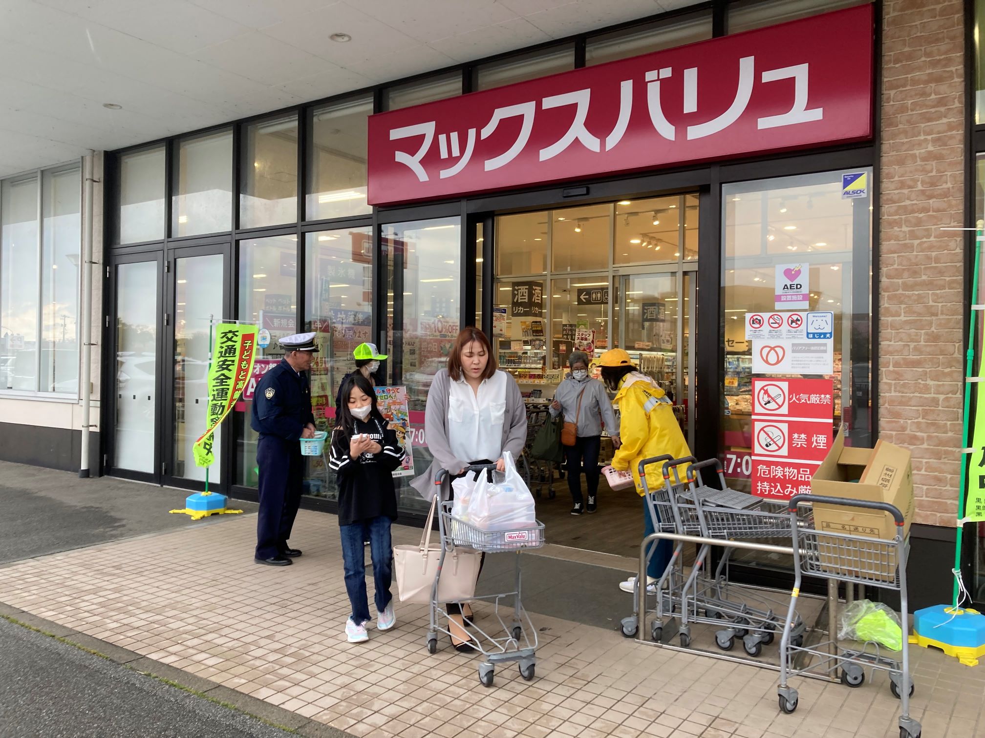 来店者に「事故防止」を呼びかける参加者 配布したポケットティッシュ