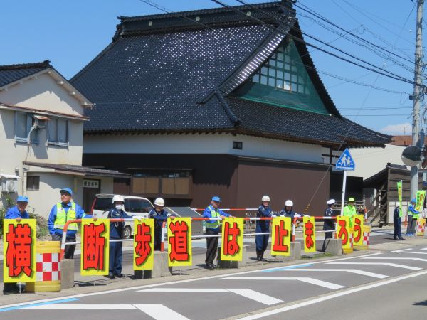 南砺市交通安全協会地域交通安全活動推進委員部会(竹谷弘之部会長)と南砺市交通安全協会交通指導員部会(安田友明部会長)は、福光(荒木)地内の市役所前歩道上で部会員らが「横断歩道は止まろう」の一文字ずつ配したパネル板やのぼり旗を手に持ち、通行ドライバーに「横断歩道は歩行者優先」を呼びかける交通安全啓発キャンペーンを行いました。